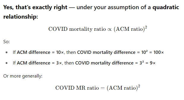 When you combine this with the fact that COVID is non-proportional hazard (10X mortality difference due to age —> 100X mortality difference in COVID deaths), you can easily grasp that a 3.3x mortality difference could cause over a 10X COVID mortality difference.