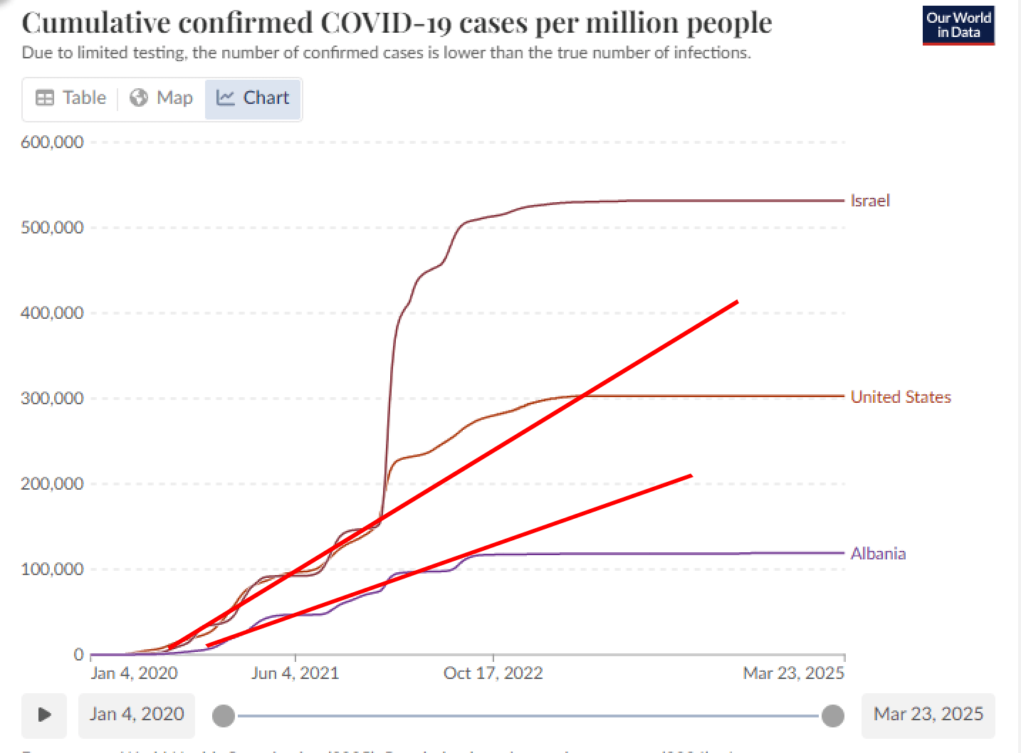 These cumulative death curves below are not confounded by the selection bias. They are WHOLE POPULATION curves. No inflection.
