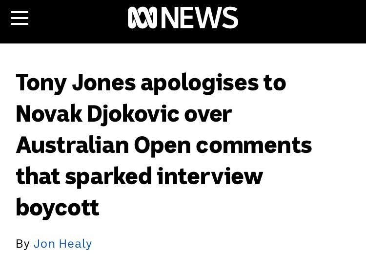 After beating Jiří Lehečka to advance to the quarterfinals, (https://www.abc.net.au/news/2025-01-19/australian-open-live-novak-djokovic-carlos-alcaraz-coco-gauff/104833566) Djokovic issued a short statement on court rather than a full interview with commentator Jim Courier, revealing he was boycotting the traditional post-match chat over “insulting and offensive comments” by Jones on host broadcaster Channel Nine.