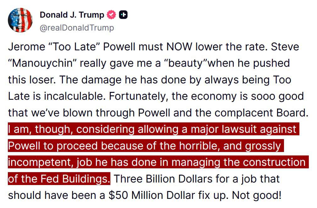 Jerome “Too Late” Powell just got hit with more than a rate-cut demand from Trump, who is now publicly considering allowing a “major lawsuit” against the Fed Chair over what he calls “horrible” and “grossly incompetent” mismanagement of a Federal Reserve building project.