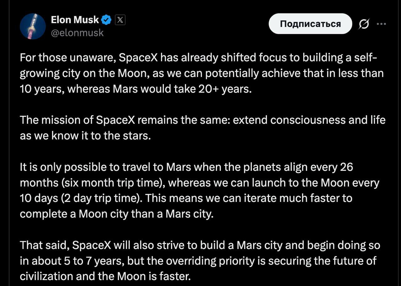 SpaceX has already shifted its focus to building a self-sustaining city on the Moon, as it is potentially feasible in less than 10 years, compared to over 20 years on Mars.